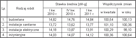 Poniżej przedstawiam stawki robocizny i narzuty z I kwartału 2011 r., konfrontując je równocześnie z odpowiednimi wartościami z I kwartału 2010 r. i IV kwartału 2010 r. W dwóch ostatnich kolumnach ukazuję współczynniki zmian.