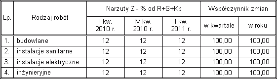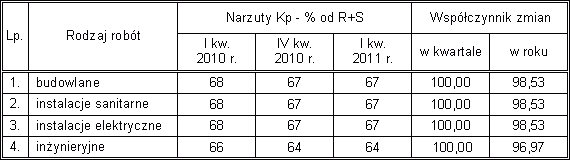 Wskaźniki narzutów kosztów pośrednich i zysku w ostatnim kwartale 2010 r. pozostały bez zmian. Biorąc pod uwagę roczny okres, wskaźniki narzutu zysku są na identycznym poziomie jak w I kwartale 2010 r., natomiast wskaźniki narzutu kosztów pośrednich są niższe o jeden punkt procentowy, za wyjątkiem robót inżynieryjnych przy którym wskaźnik jest niższy o dwa punkty procentowe.