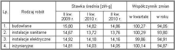 Z prowadzonych badań i analiz wynika, że stawki robocizny w II kwartale 2010, w stosunku do I kwartału 2010, uległy niewielkiemu podniesieniu. W zależności od branży robót wzrosły one średnio od 0,14% do 0,29%.