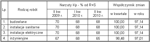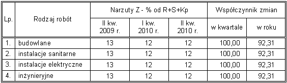 Poniżej przedstawiam stawki robocizny i narzuty z II kwartału 2010 r., konfrontując je równocześnie z odpowiednimi wartościami z II kwartału 2009 r. i I kwartału 2010 r. W dwóch ostatnich kolumnach ukazuję stosowane współczynniki zmian.