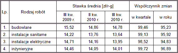 Z prowadzonych badań i analiz wynika, że stawki robocizny w III kwartale 2010, w stosunku do II kwartału 2010, w stopniu niewielkim spadły. W zależności od branży robót zmniejszyły się średnio od 0,28% do 0,87%.