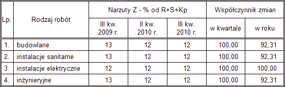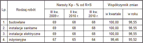 W okresie rocznym, przyjmując za punkt odniesienia III kwartał 2009, stawki robocizny kosztorysowej zmniejszyły się w zależności od branży w przedziale od 3,11% do 5,17%, przy jednoczesnym spadku o kilka punktów procentowych wskaźników narzutów kosztów pośrednich i zysku.
