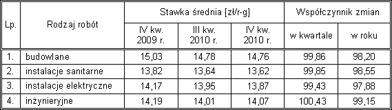 Poniżej przedstawiam stawki robocizny i narzuty z IV kwartału 2010 r., konfrontując je równocześnie z odpowiednimi wartościami z IV kwartału 2009 r. i III kwartału 2010 r. W dwóch ostatnich kolumnach ukazuję współczynniki zmian.
