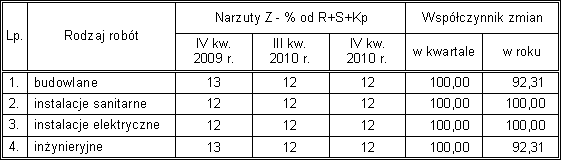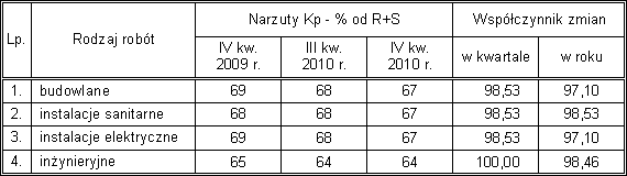 W okresie rocznym, przyjmując za punkt odniesienia IV kwartał 2009 r., stawki robocizny kosztorysowej zmniejszyły się w przedziale (w zależności od branży) od 0,85% do 2,12%, przy jednoczesnym spadku o kilka punktów procentowych wskaźników narzutów kosztów pośrednich i zysku. Wyjątek stanowi niezmieniony wskaźnik narzutu zysku dla instalacji elektrycznych i sanitarnych.
