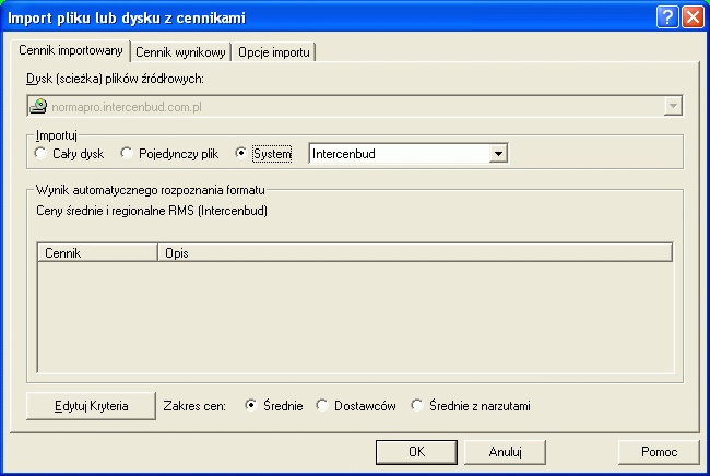 Pokazuje się nam poniższe okienko – wybieramy „Importuj” – „System Intercenbud”. W tym miejscu zaznaczamy „Zakres cen” – cennik, który chcemy zaimportować. Jest to ważne okienko, gdyż w ten sposób cenniki importujemy pojedynczo (z płyty CD mogliśmy zaznaczyć cały komplet).