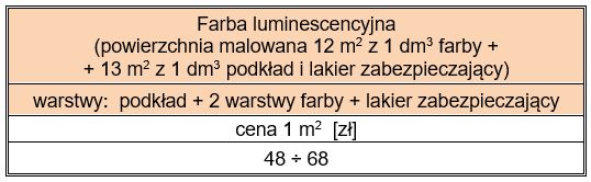 Farby luminescencyjne: 175 zł/dm³ do 290 zł/dm³ + podkład około 50 zł/dm³ i lakier zabezpieczający około 50 zł/dm³.