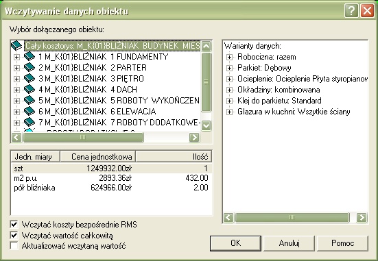 Podzielone jest ono na trzy pola. W polu głównym znajduje się przedstawiona w formie drzewa struktura kosztorysu. Rozwijając poszczególne gałęzie drzewa możemy dojść poprzez poziomy działów do pojedynczych pozycji kosztorysu i zaznaczyć ten element, który chcemy wstawić do kosztorysu aktualnie tworzonego. Jeżeli dla wstawianego elementu zostały określone parametry ekonomiczno-techniczne, to są one wykazane w lewym dolnym polu. (O roli parametrów ekonomiczno-technicznych w kosztorysie szczegółowo pisałem w artykule Co to są i do czego służą parametry ekonomiczno- techniczne - BzG nr 4/2006). Dzięki temu użytkownik może wybrać odpowiednią jednostkę obmiaru widząc jednocześnie wyliczoną dla niej cenę jednostkową. W przypadku pozycji rolę parametrów ekonomiczno-technicznych pełni obmiar pozycji i przypisana do niego jednostka miary. Dodatkowo jest tu też podana jako jednostka sztuka i obmiar 1, czyli taka pozycja będzie traktowana jako jednokrotne wykonanie danej roboty. Prawe pole okna Wczytywanie danych obiektu służy do określenia aktywności wariantów (oczywiście, o ile takie w kosztorysie źródłowym występują). Po lewej stronie u dołu okna znajdują się trzy hasła: Wczytać koszty bezpośrednie RMS, Wczytać wartość całkowitą i Aktualizować wczytaną wartość. Zaznaczenie drugiego z nich spowoduje, że koszty bezpośrednie, nawet jeżeli zostaną wczytane, to traktowane będą jedynie informacyjnie. Wartość pozycji będzie wyliczana poprzez jej cenę jednostkową. Gdy zaznaczymy pierwsze z haseł, a nie zaznaczymy drugiego, to wartość całkowita zostanie wyliczona z kosztów bezpośrednich z uwzględnieniem określonych dla kosztorysu narzutów. Trzecie hasło służy do powiązania na stałe wprowadzonego obiektu z kosztorysem, z którego został pobrany. Zaznaczenie tego hasła spowoduje, że jeżeli w kosztorysie źródłowym zostaną dokonane zmiany mające wpływ na wartość obiektu i zostanie on zapisany na dysk pod tą samą nazwą i w tej samej lokalizacji, to podczas kolejnego wczytania kosztorysu zawierającego obiekt, jego wartość zostanie zmieniona. Jeżeli podczas wprowadzania obiektu nie zaznaczyliśmy hasła Aktualizować wczytaną wartość, to możemy to zrobić wykorzystując zakładkę Ceny jedn. w oknie edycji danych pozycji, na której znajduje się takie samo hasło.