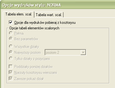 Wprawdzie to, o czym do tej pory napisałem, dotyczy wyglądu formularza na ekranie, ale ma to również związek z wydrukiem. Otóż, w Opcjach wydruku dla Tabeli Elementów Scalonych istnieje checkbox Opcje dla wydruków pobieraj z kosztorysu. Jeżeli go zaznaczymy, ustawianie opcji w tym dialogu stanie się niemożliwe, bowiem automatycznie zostaną one przeniesione z ustawień opcji kosztorysu.