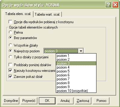 Możemy zatem określić, czy w tabeli mają się znajdować kolumny zawierające kwoty przypadające na jednostkę elementarną (parametry ekonomiczno-techniczne) – zaznaczamy hasło Pełna, czy też chcemy tabelę Bez parametrów. Następnie określamy liczbę poziomów działów, które mają znaleźć się na wydruku. Możemy wybrać widok wszystkich działów, albo tylko działów kilku najwyższych poziomów, poczynając od wybranego z rozwijalnej listy. W sytuacji, gdy w tabeli uwidoczniamy kilka poziomów działów, możemy określić kolejność ich prezentacji od najniższego do najwyższego (domyślnie) lub od najwyższego do najniższego. Wówczas zaznaczamy opcję Poddziały poniżej działów.