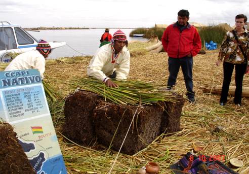 Budowa taka, w której jako widz miałem okazję uczestniczyć, rozpoczyna się od wycinania kawałków brzegu, stanowiącego ciasno splątaną mieszaninę korzeni nadwodnej roślinności, o miąższości dochodzącej po wycięciu, do około metra. Z takich to też prefabrykatów, za pomocą drewnianych kołków, drutu lub sznurka (wersja dla bogatszych) albo i trzcin (dla biedniejszych) skleca się na wodzie rodzaj pływającej tratwy, o znacznych wymiarach, największe wyspy jakie widziałem sięgały ponad 500 m². Stykające się w wodzie boki powiązanych „prefabrykatów” trzcinowych [fot. 9] szybko zrastają się w swoisty monolit. W kolejnym etapie budowy wykonywana jest nawierzchnia z surowca również miejscowego, czyli trzciny totora, niegdyś licznie porastającej brzegi tego ogromnego jeziora. Układa się je na krzyż, w kilku kolejnych warstwach, a jej leciutkie, puste w środku, naturalnie pozamykane na końcach łodygi, stosunkowo długo opierające się działaniu wody, są doskonałym, niezatapialnym materacem pływającym. Oczywiście, po pewnym czasie nawierzchnia taka w końcu rozmięka i gnije, jej renowacja nie jest jednak zbyt kapitałochłonna – układa się po prostu kolejną warstwę trzciny.