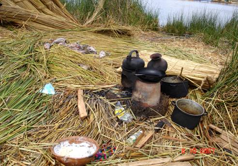 Wyprute flaki patroszonych zwierząt rozrzucone są po całej wyspie, daje to szansę przywabienia kolejnego skrzydlatego posiłku. Dopiero jak zaczynają cuchnąć, oddaje się je głębinom jeziora – może ryby nie okażą się zbyt wybredne. No bo jakoś trzeba się jezioru zrewanżować za zapewnienie bezpieczeństwa pożarowego (– posiłki gotowane są na niewielkich ogniskach, rozpalanych wprost na trzcinowej nawierzchni wyspy) czy pomoc w przechowywaniu produktów żywnościowych – przez zanurzenie w siatce spuszczonej do wody (o prawie stałej przez cały rok temperaturze ok. 6-7ºC, wszak to wysokość blisko 4000 m n.p.m.) z krawędzi wyspy.