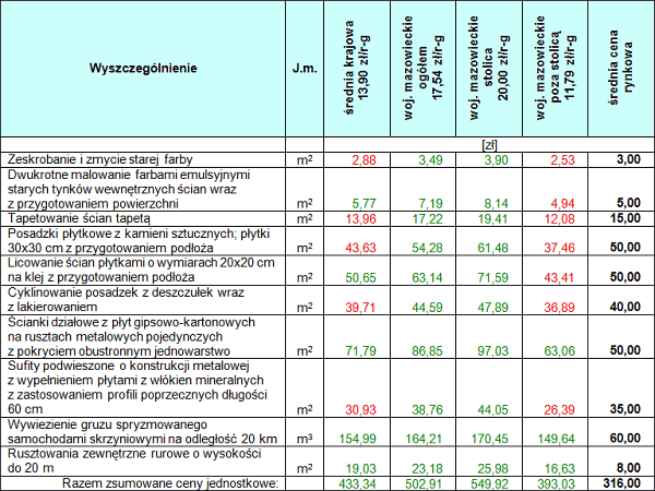 Ceny rynkowe zostały ustalone na podstawie kilku cenników detalicznych firm budowlanych oferujących wykonanie robót na terenie województwa mazowieckiego. Rzeczywiste stawki za roboczogodzinę charakteryzują się na tym terenie znacznym zróżnicowaniem, jednak cenniki nie wykazywały takiego zróżnicowania. Co więcej, po kilku rozmowach telefonicznych uzyskałem zapewnienie, że podawane ceny nie zależą od lokalizacji i tak naprawdę zostaną dotrzymane (oczywiście przy założeniu, że nie mamy do czynienia z pomalowaniem jednej ściany).