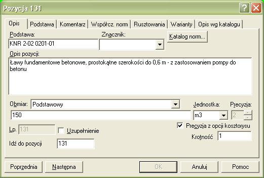 Zwrócił się do mnie niedawno jeden z użytkowników Normy z postulatem, aby rozszerzyć funkcjonalność programu o automatyczną wymianę pozycji kosztorysowej na inną w przypadku gdy zostanie zmieniona podstawa wyceny (list nr 7 od Czytelnika). Chodzi o to, że na przykład mam w kosztorysie pozycję z KNR nr 2-02 0201-01 Ławy fundamentowe, prostokątne szerokości do 0,6 m i chcę ją zastąpić pozycją z KNR nr 0-20 0264-01 Ławy fundamentowe betonowe prostokątne o szerokości do 0,6 m w deskowaniu PERI. Użytkownik chciałby móc wywołać okno edycji danych pozycji