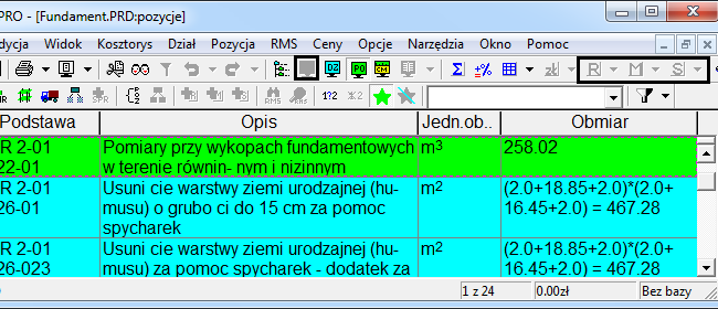 Zmieniamy to ustawienie wybierając pozycję „Kosztorys” i klikamy "OK". Program zacznie wprowadzać nakłady RMS (pobrane z bazy normatywnej programu) do poszczególnych pozycji w dokumencie.