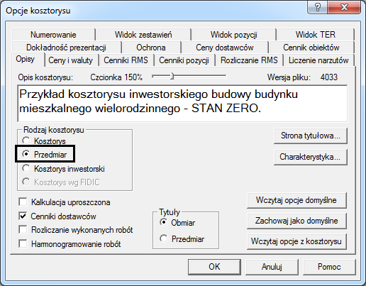 Oznacza to, że po wywołaniu z prawego panelu właściwości „Opcji kosztorysu”, na domyślnej zakładce „Opisy” będzie zaznaczona opcja –