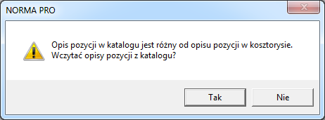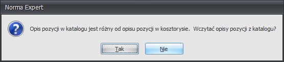 W trakcie konwersji może pojawić się kilka komunikatów. Poniżej widzimy przykładowe okienko, w którym możemy zdecydować, czy program ma pozostawić opisy pozycji w niezmienionej formie, czy powinien je wczytać z katalogów. Bardzo często opisy zmieniane są celowo, dlatego lepiej wybrać opcję „Nie”. Bywają jednak przedmiary, w których brakuje polskich znaków (jest to związane zazwyczaj z kodowaniem polskich liter przez wirtualne drukarki PDF) i wtedy, żeby nie tracić czasu na ręczną korektę takich pozycji, lepiej wybrać „Tak”.