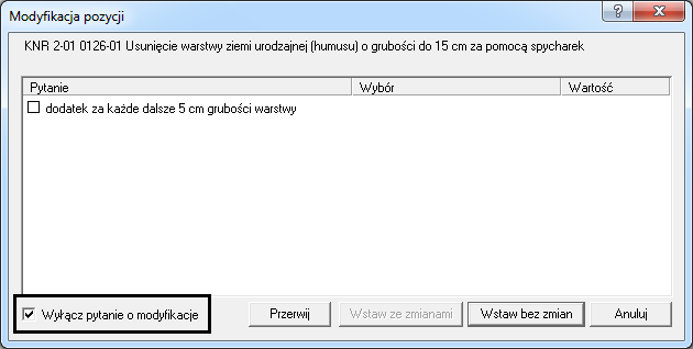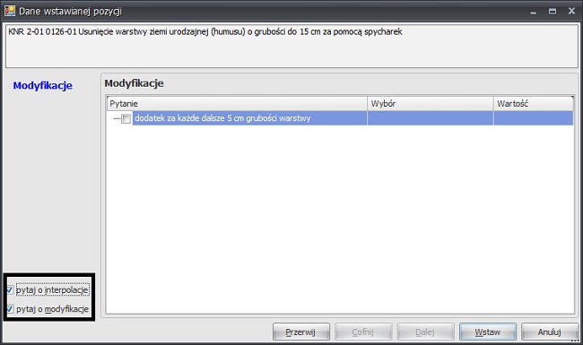 Kolejne okno dotyczy mechanizmu modyfikacji i interpolacji. Będzie się ono pojawiać w przypadku pozycji zawierających dodatkowe pytania. Można zrezygnować z wyświetlania tych podpowiedzi po wyłączeniu opcji „pytaj o modyfikacje” i „pytaj o interpolacje”.
