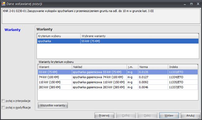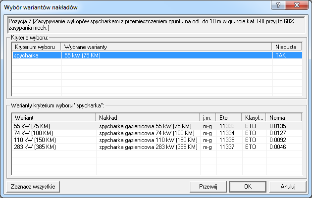 Norma może również poprosić o „Wybór wariantu nakładów” (okienko poniżej). W tym przypadku musimy (nie możemy tego mechanizmu wyłączyć) wskazać jeden nakład, wszystkie lub zatwierdzić wybór domyślny przyciskiem „OK”.
