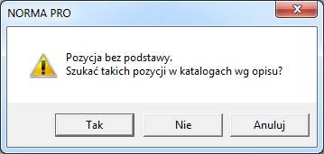 Nowością w Normie 4.36 jest możliwość pomijania pozycji bez podstaw - wystarczy na przedstawione poniżej pytanie odpowiedzieć „Nie” (okienko pojawia się zazwyczaj w przypadku pozycji niekatalogowych). Po wybraniu przycisku „Tak”, program będzie działał tak jak dotychczas, czyli zacznie wyszukiwać pozycje sugerując się tylko ich opisami.