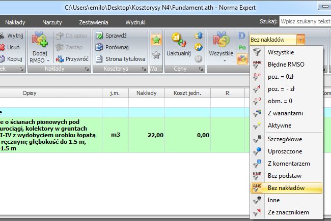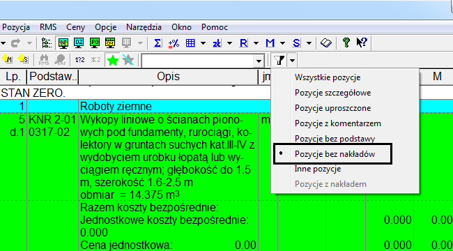 uaktywnić widok kosztorysu ("F5") i wybrać filtr pozycji „Bez nakładów”.