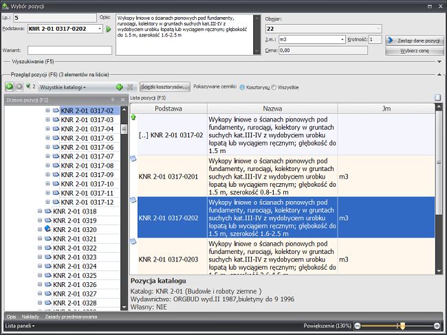 Po wciśnięciu przycisku „KNR” program wyświetli okno katalogów a w nim tablicę z szukaną pozycją. Tradycyjny „dwuklik” myszką, „Enter” na klawiaturze lub przycisk „Zastąp dane pozycji”, wstawi do kosztorysu podświetloną pozycję w formie szczegółowej.