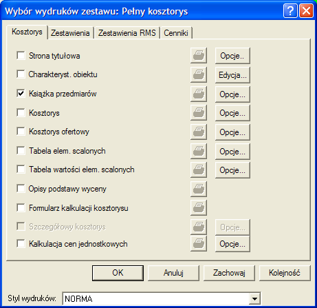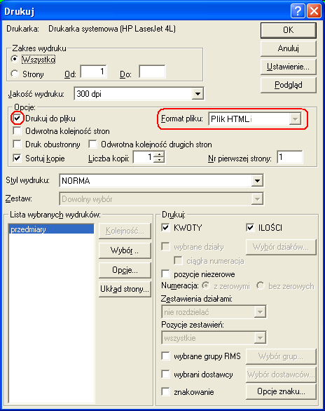 - W oknie dialogowym „Drukuj”, w sekcji „Lista wybranych wydruków” klikamy w polecenie „Wybór” i zaznaczamy do wydruku „Książka przedmiarów” zatwierdzając poleceniem „OK”.