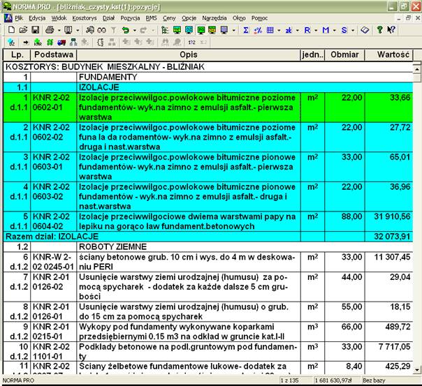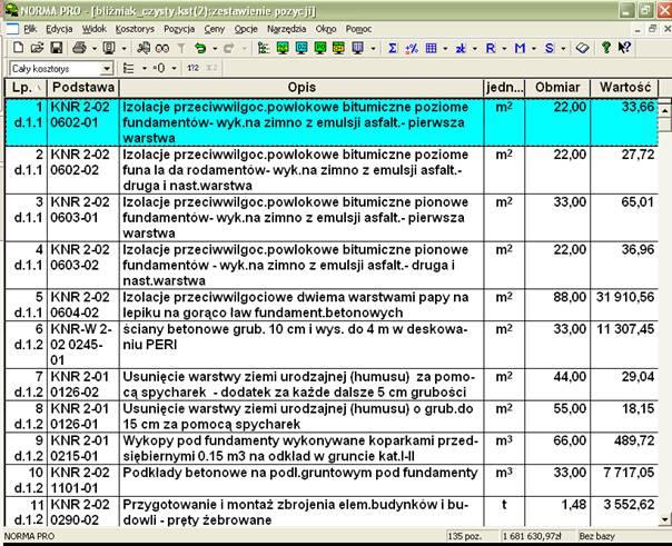 Mógłby więc zapytać ktoś dlaczego istnieją w programie dwa, na pozór jednakowe zestawienia. Czy to pomyłka programistów? Otóż nie. Jest to efekt świadomego działania. Zestawienie pozycji jest jednym z zestawień danych kosztorysu, które podlega tym samym zasadom jak wszystkie inne zestawienia danych w programie, z możliwością sortowania włącznie. Jest to po prostu zbiór elementów kosztorysu jakimi są jego pozycje. Natomiast Lista pozycji jest inną formą prezentacji kosztorysu. Jest to przedstawienie kosztorysu w postaci uproszczonej.