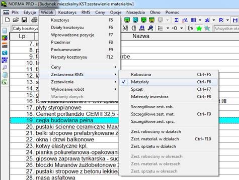 Rys.1. Włączenie widoku Zestawienia materiałów w programie Norma PRO