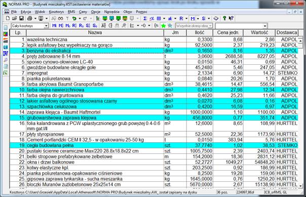 Rys.4. Widok Zestawienia materiałów w programie Norma PRO po zmianie danych o Dostawcy