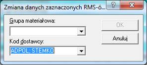 W kolejnym kroku należy z menu RMS wybrać polecenie Zmień RMSy… i w sekcji Kod dostawcy należy wpisać nowy kod, wybrać z listy lub skasować aktualny tekst (w przypadku usunięcia danych o Dostawcy).