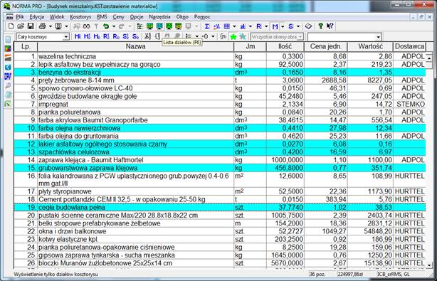 Rys.2. Widok Zestawienia materiałów w programie Norma PRO przed zmianą danych o Dostawcy