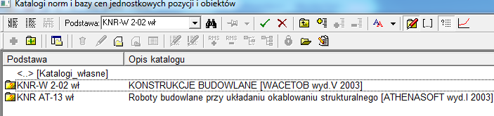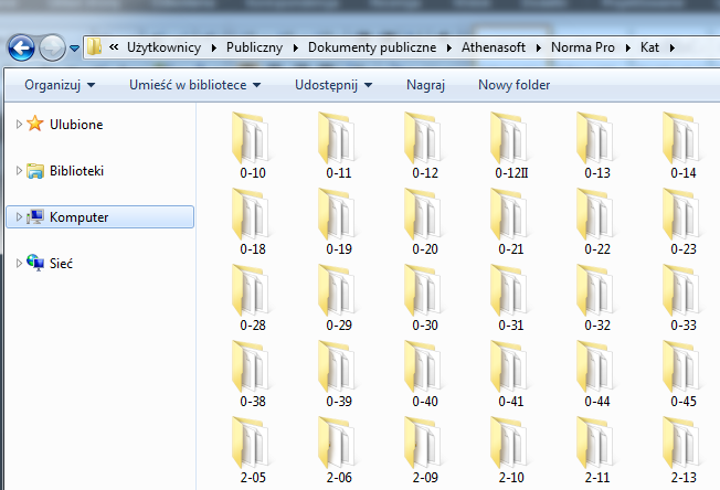 Aby objaśnić sposób przeniesienia katalogów muszę najpierw opisać strukturę danych katalogowych na dysku. Jeżeli podczas instalacji programu nie dokonano modyfikacji standardowego ustawienia ścieżek, to program jest zainstalowany w domyślnym folderze, który jest uzależniony od posiadanego systemu operacyjnego. W przypadku Windows’a XP jest to folder na dysku C:\Program Files\Athenasoft\Norma Pro (lub Norma Standard). W przypadku nowszych systemów takich jak Vista i Windows 7 jest to folder C:\Users\Public\Documents\Athenasoft\Norma Pro (lub Norma Standard). Wewnątrz folderu Norma ... znajduje się między innymi folder KAT. Jak łatwo się domyślić, w nim umieszczone zostały wszystkie katalogi, w tym również katalogi własne. Każdy z katalogów mieści się w osobnym folderze, którego nazwa odpowiada zazwyczaj numerowi katalogu. Katalog KNR nr 2-02 mieści się w folderze 2-02, KNR-W nr 2-02 w folderze 2w02 itd. Są jednak wyjątki od tej zasady. Na przykład katalogi TZKNBK (popularnie zwane PKZ-ami) mieszczą się w folderach oznaczonych z-1, z-2 i tak dalej. W każdej jednak sytuacji nazwa folderu wiąże się z nazwą lub numerem katalogu. Podobnie jest też z katalogami własnymi.